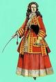 Поскольку верховая езда играла в жизни людей той эпохи существенную роль и, кроме того, являлась модным видом спорта, занимавшиеся верховой ездой дамы приняли наиболее практичный для своего времени стиль одежды. То есть костюм дамы-наездницы был, за исключением юбки, точной копией костюма мужского. Камзол или казакин повторял мужской. На нем сзади и но бокам делались разрезы (боковые разрезы прикрывались складками материи), что увеличивало ее видимый объем. Камзол можно было застегнуть спереди на пуговицы от шеи до подола, однако его всегда носили нараспашку, так, чтобы был виден облегающий жилет, застегнутый только у талии. Застежка была сделана на мужской манер - слева направо. Вверху между бортами камзола или казакина и жилета виднелось модное в то время шейное украшение - шарф Steinkirk. Распахнутые полы являли взору очень широкую "стоячую" оборку, начинавшуюся примерно у середины юбки. Юбка была свободной и доходила примерно до щиколотки. По подолу ее украшала широкая полоса кружева. Волосы скрывал парик - опять-таки как у мужчин. Локоны парика обрамляли лицо и ниспадали с обеих сторон на спину. Шляпу-треуголку надевали или просто носили с собой. На руки надевали короткие с раструбами перчатки для верховой езды и носили украшенную кисточкой плетку.