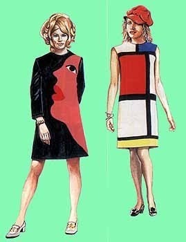 Поиск новых идей в моде продолжался и в шестидесятые годы. Слева представлено вечернее шерстяное платье-джерси в стиле "поп-арт", навеянное работами американского художника Энди Уорхолла и разработанное Ивом Сен-Лораном. У этого простого одноцветного платья длинные, до запястий, рукава. И на этом темном одноцветном фоне от плеч до бедер простирается аппликация, сделанная в виде рисунка в стиле "поп-арт".